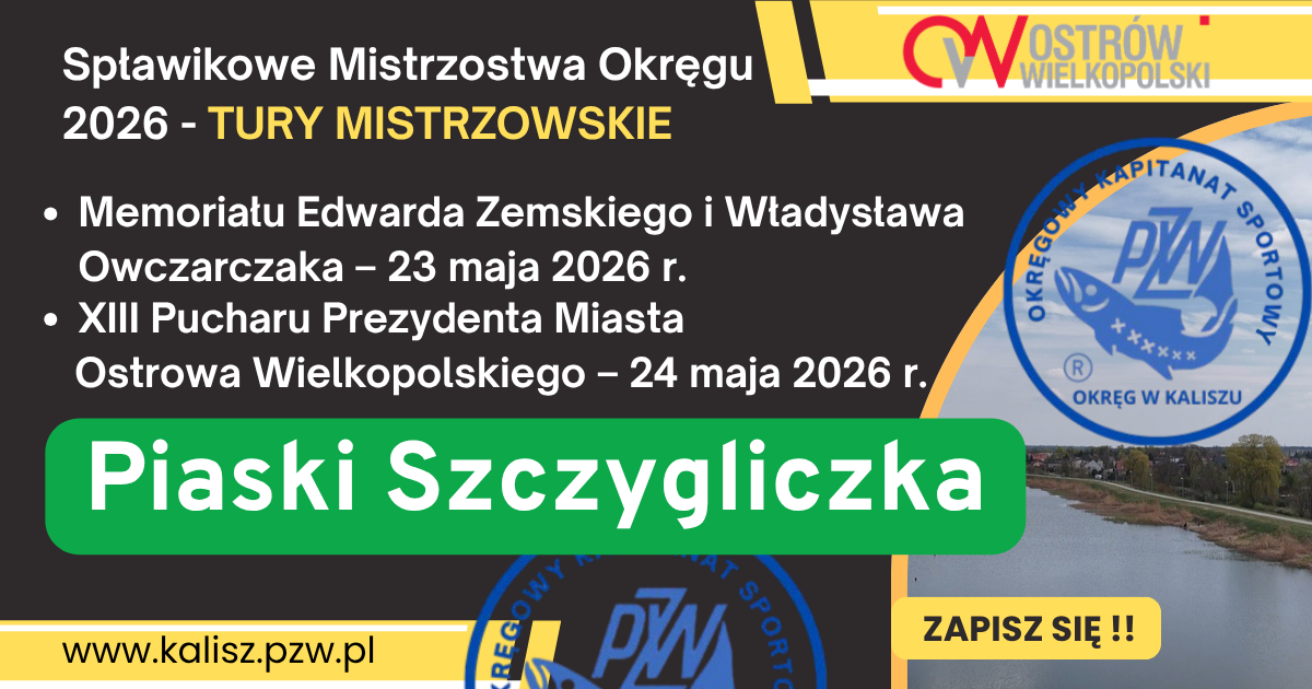 Okręgowy Kapitanat Sportowy PZW w Kaliszu zaprasza na finałowe tury Spławikowych Mistrzostw Okręgu 2026, które jednocześnie rozegrane zostaną w ramach: